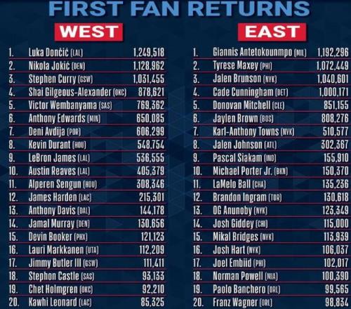 全明星首轮投票结果:詹姆斯仅排名西部第九,东契奇西部第一!